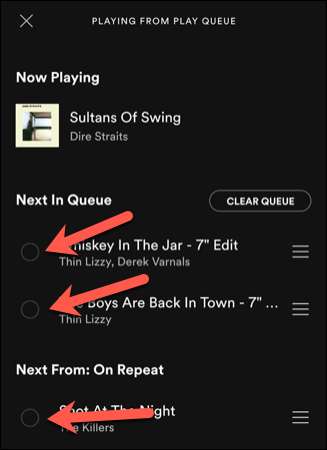 Du skal vælge eventuelle sange, du ønsker at fjerne fra din kø, uanset om de er afspilningsliste sange eller sange, du har tilføjet manuelt. For at gøre dette skal du trykke på det runde ikon ved siden af sangen (eller sange), du søger at fjerne.