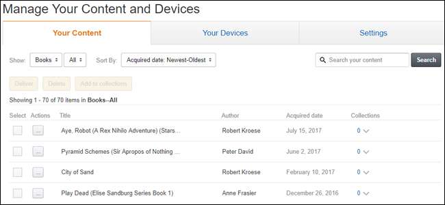 Denne side viser dig alt, hvad du har købt på din Kindle via Amazon. Ovenstående link fører dig specifikt til "Bøger", men du kan bruge rullemenuen i øverste venstre hjørne til at vælge magasiner, lydbøger eller endda apps fra Amazon Appstore. Vi holder os til bøger til denne demonstration.