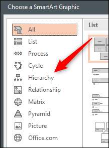 Du vil nu se en lille samling af hierarki smartart grafik. For standard familietræer, " Organisatorisk diagram "Option er ideel. Du kan dog vælge, hvilken smartart grafik der fungerer bedst for dig.