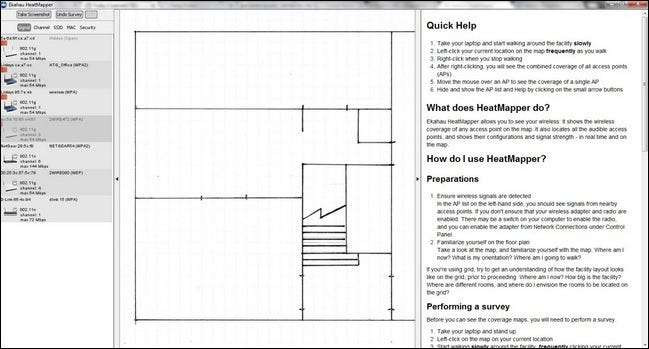 I midten er dit kort (eller gitter, hvis du skal kortløse), og til højre er en hurtigstartsinstruktionsguide. Du kan klikke på den smalle lodrette stribe på de indre kanter på både AP-listen og instruktioner for at minimere dem til siden af HeatMap-applikationsvinduet.