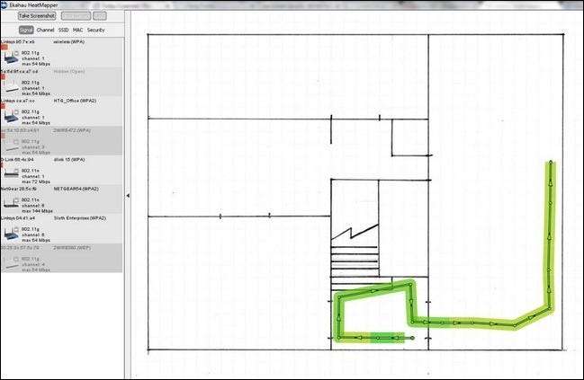 På venstre side er et smalt panel, der viser alle de Wi-Fi-adgangspunkter, din bærbare computer kan registrere. Vær ikke bekymret over tilstedeværelsen af adgangspunkter, du ikke er ligeglad med (f.eks. AP'er fra et andet kontor, din nabo osv.), Da vi kan filtrere dem senere, før vi gemmer vores varmekort.