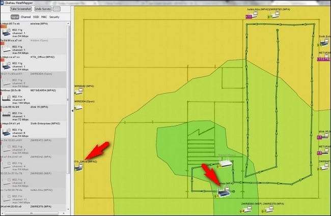 Men når vi var færdige med at gå hele kortet, lokaliserede HeatMapper placeringen af de to adgangspunkter på vores kontor med uhyggelig præcision. Se på de røde pile på kortet nedenfor: