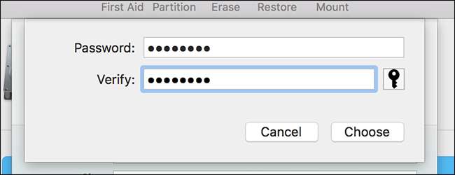 Når du vælger et krypteret drev, bliver du også bedt om at oprette en krypteringsadgangskode til dit diskbillede. Angiv en stærk adgangskode - du kan bruge knappen "Nøgle" her for at få tip til at oprette en stærk adgangskode.