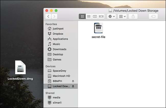 Du kan nu gøre hvad du vil med din krypterede .dmg-fil. Gem det på din harddisk, kopier det til et USB-drev, eller opbevar det endda online ved hjælp af en skyfilopbevaringstjeneste som Dropbox. Folk kan ikke få adgang til dets indhold, medmindre de har den adgangskode, du har angivet. Du kan montere den krypterede fil på enhver Mac, så længe du har adgangskoden.