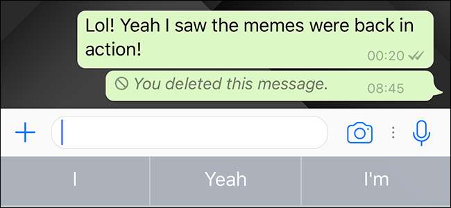 Med WhatsApp er der to muligheder, når du sletter meddelelser. Hvis du sletter en besked, du sender inden for syv minutter efter, at den er sendt, kan du fjerne den fra hver modtagers enhed. Dette fungerer, hvad enten du sender en person eller en gruppe beskeder. De ser bare en note, der siger, at meddelelsen blev slettet. Selvom de allerede har læst den, så længe du sletter den inden for de syv minutter, forsvinder beskeden (selvom de sandsynligvis stadig vil huske, hvad den sagde).