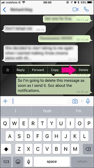 For at slette en WhatsApp-besked på iOS skal du trykke længe på den og derefter trykke på knappen Slet efterfulgt af sletteikonet.