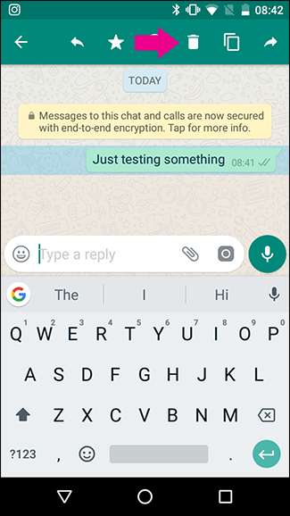 For at slette en WhatsApp-besked på Android skal du trykke længe på den og derefter trykke på ikonet for sletning.