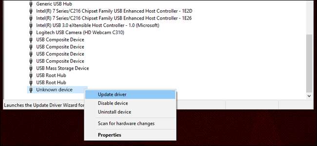 Din enhed vises muligvis under dens specifikke underafsnit (tastaturer under "Tastaturer", webkameraer under "Billedbehandlingsenheder" osv.), Men det er mere sandsynligt, at det bliver mærket som "Ukendt enhed", enten alene eller under " Universal Serial Bus controllers ”sektion. Højreklik på enheden, og vælg derefter "Opdater driver."