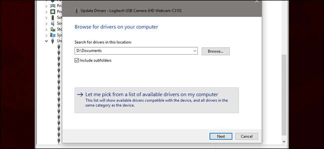 På det næste skærmbillede skal du klikke på "Lad mig vælge fra en liste over tilgængelige drivere på min computer."
