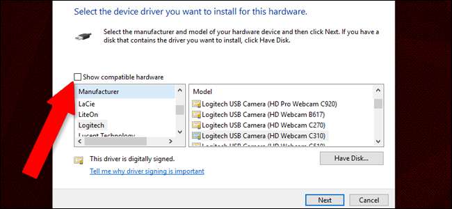 På denne skærm vil du være heldig, hvis du kan se den driver, du manuelt har installeret fra den medfølgende disk eller internettet. Hvis ikke, fjern markeringen fra "Vis kompatibel hardware" for at se en liste over alle de drivere, der aktuelt er installeret på din maskine. Klik på den relevante producent i venstre rude og derefter den korrekte driver til højre.
