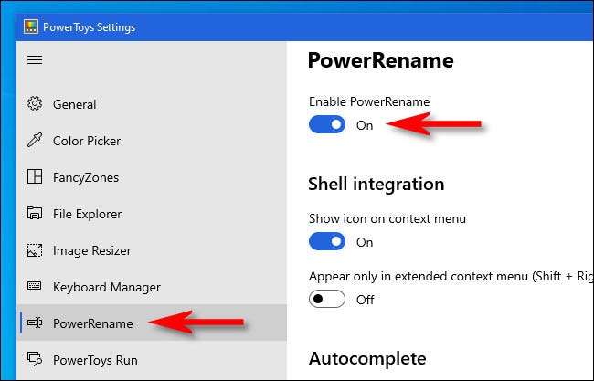 Når du har installeret PowerToys, skal du starte PowerToys-indstillinger og klikke på "PowerRename" i sidepanelet. Sørg for, at kontakten ved siden af "Aktiver PowerRename" er tændt.