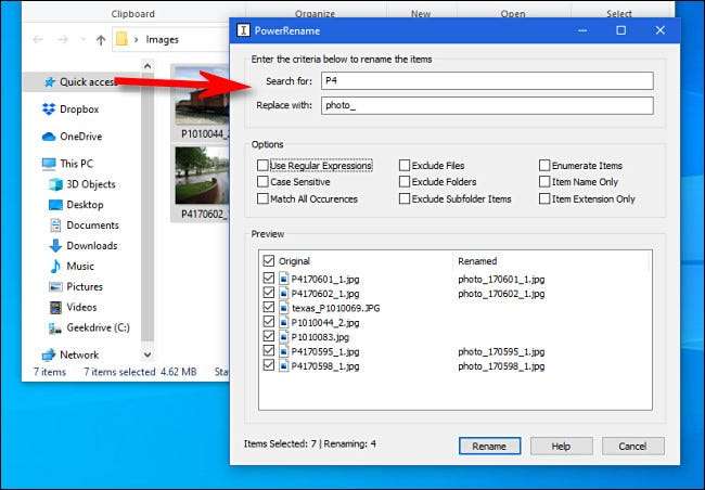 Her er et eksempel, hvor "P4" i hvert filnavn er blevet erstattet med "Photo_." Den pæne ting er, at PowerRename giver et eksempel på, hvad de omdøbte filer vil se ud lige der i vinduet. På den måde behøver du ikke gætte, hvad resultatet kan være.