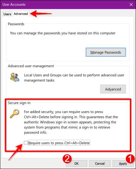 Panelet Brugerkonti vises på skærmen. Klik på fanen "Avanceret" (hvis den ikke er indlæst som standard). Find indstillingen "Kræv, at brugere skal trykke på Ctrl + Alt + Slet", der er angivet under "Sikker login". Marker for at aktivere eller fjerne markeringen for at deaktivere.
