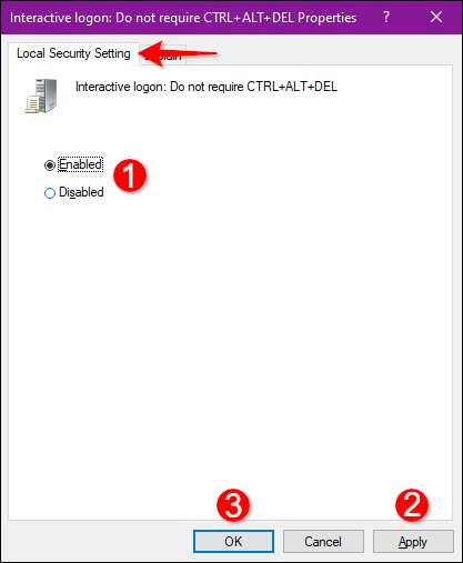 Postens egenskabspanel vises på skærmen med fanen "Lokal sikkerhedsindstilling" vist som standard. Klik på en alternativknap for at aktivere eller deaktivere denne funktion. Afslut ved at klikke på knappen "Anvend" og derefter på "OK" -knappen.