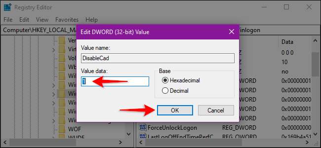 Bemærk: Hvis du ikke kan se en "DisableCad" -post i "Winlogon" -indstillingerne, skal du højreklikke på "Winlogon", vælge "Ny" i pop op-menuen og derefter klikke på "DWORD (32-bit) værdi" i den næste liste. Navngiv dette nye DWORD som “DisableCAD” (uden anførselstegn), og skift dets værdi.