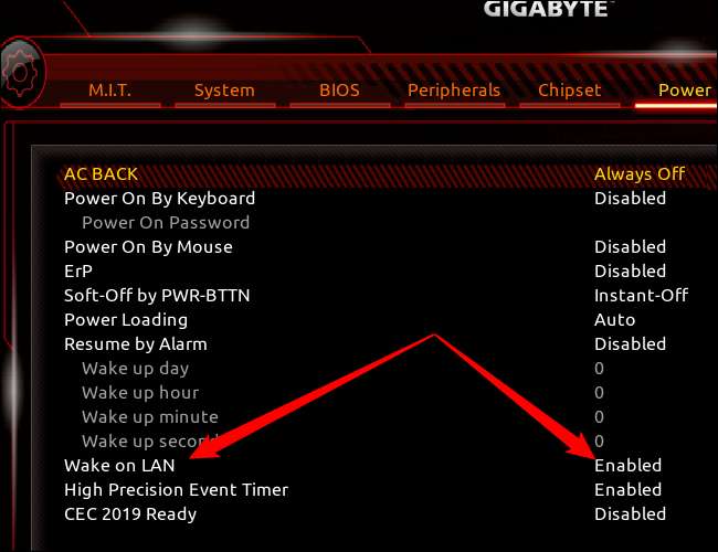 I lyset af BIO'erne kan Wake-on-LAN-indstillingen organiseres forskelligt, og funktionen kan pakkes som en del af et større sæt funktioner. På denne eksempel PC blev WOL-funktionen fundet under Power som egen post. Hvis du ikke kan finde funktionen, skal du søge efter det på Google ved hjælp af dit bundkorts mærke og modelnummer.