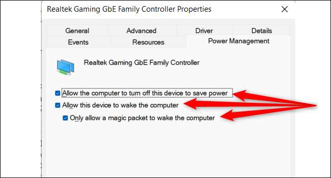 Et egenskabsvindue åbnes. Klik på fanen "Power Management" og sørg for, at alle tre bokse der er markeret, herunder: