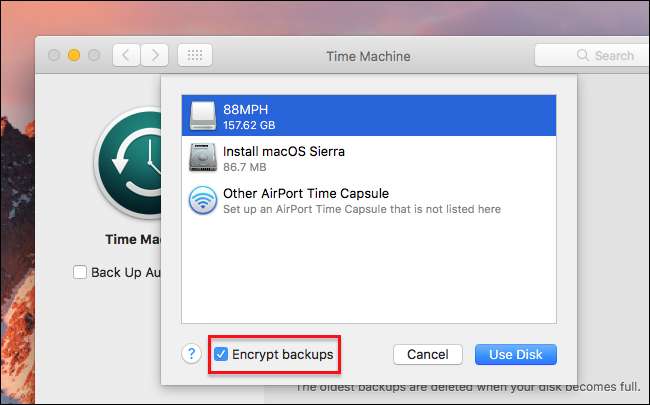 Klik på dit gamle Time Machine-drev på listen over muligheder, og marker derefter indstillingen "Krypter sikkerhedskopier".