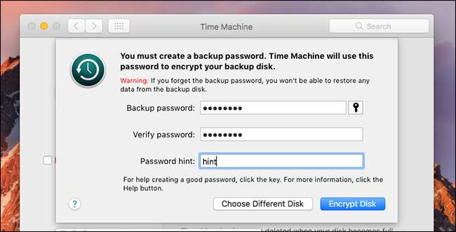Hvis du mister denne adgangskode, kan du ikke gendanne nogen filer fra drevet, så du må ikke miste adgangskoden. Skriv den ned, og opbevar den et sikkert sted, som en låsekasse, og opbevar den også i din adgangskodeadministrator . Hvis du har brug for hjælp til at tænke på et kodeord, skal du klikke på nøgleikonet for at hente macOS-adgangskodeassistenten.