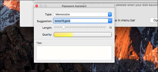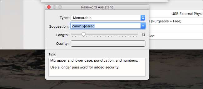 Uanset hvad du vælger, skal du sørge for ikke at miste denne nøgle: du kan ikke gendanne filer fra dit drev uden den. Skriv det ned, og læg det i din låsekasse, og opbevar det i din adgangskodeadministrator . Hvis du vil, kan du klikke på nøgleikonet for at hente adgangskodeassistenten, som kan hjælpe dig med at oprette en adgangskode.