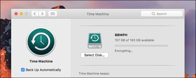 Hvis du allerede har konfigureret Time Machine på din Mac, kan du kryptere dit drev med tilbagevirkende kraft. Processen vil tage et stykke tid - for et mekanisk drev på en terabyte kan processen tage mere end 24 timer i træk - men du kan starte og stoppe processen så mange gange, du vil.