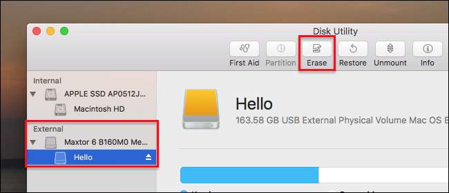 Hvis du opretter en ny harddisk med Time Machine eller bare er villig til at starte forfra med en ren partition for at undgå en lang krypteringsperiode, kan du oprette en krypteret partition ved hjælp af Diskværktøj. som du kan finde i Programmer> Hjælpeprogrammer. For at komme i gang skal du klikke på dit eksterne drev i venstre panel og derefter klikke på knappen "Slet" i værktøjslinjen.