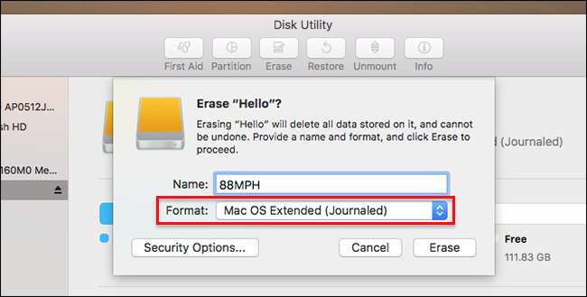 Giv partitionen et slags tidsrejserelateret navn, og klik derefter på rullemenuen "Format".