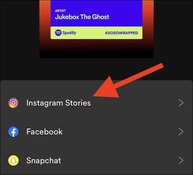 Vælg hvilken social platform du vil dele dine Spotify Wrapped 2020 resultater til. Du kan vælge mellem Instagram Stories, Facebook, Snapchat og meget mere.