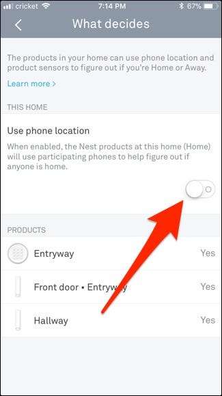 Og tænd derefter vippekontakten, der vises. Nest-appen skifter nu til status "Hjem" eller "væk" baseret på din telefons GPS-placering.