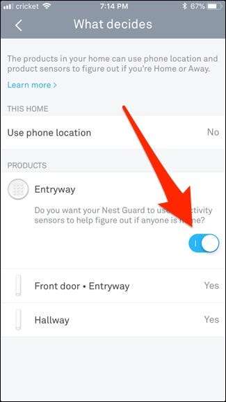 Du kan også trykke på hver enkelt sensor, der er angivet til dit Nest Secure-system, og enten inkludere eller ekskludere den fra hjemme- / udebaneassistent. Hvis du deaktiverer alt, skal du manuelt skifte til "Hjem" eller "væk" i Nest-appen for at indstille din status.