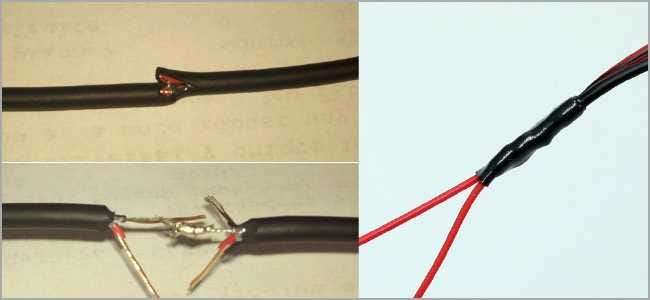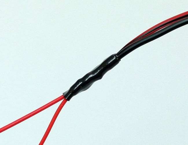 Hvis du planlægger at bruge varmekrympende rør, er det tid til at glide dem på ledningerne. Mit kabel er lille, så jeg holder fast på elektrisk tape.