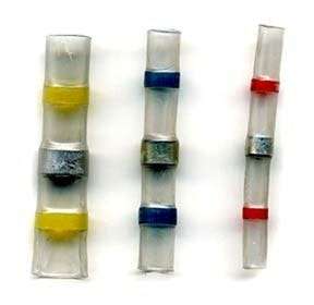 Ovenfor kan du se forskellige størrelser af "varmekrympning af loddetætning". Når det påføres med en varmepistol, smelter det specielle lodde ved en relativt lav temperatur og binder sig til din samling. Det er lavet til at være en et-trins løsning, men loddekvaliteten kan variere.