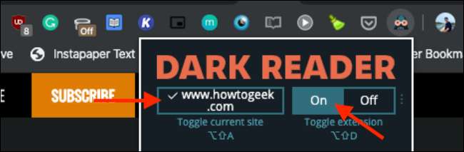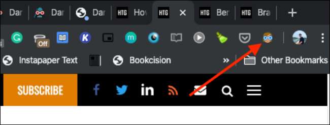 Når du har installeret udvidelsen Dark Reader Chrome eller Firefox (links ovenfor), skal du klikke på udvidelsesikonet "Dark Reader".