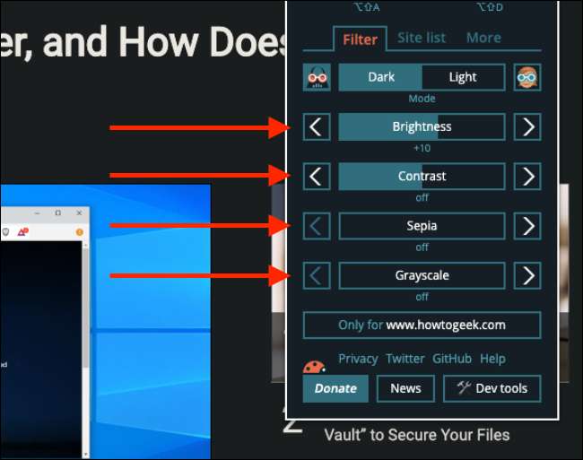 Hvis du vil deaktivere mørk tilstand for det aktuelle websted, skal du klikke på knappen "Aktiveret for aktuelt websted". Du kan ændre lysstyrken og kontrasten ved hjælp af skyderen i udvidelsesmenuen.