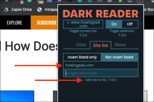 For at deaktivere den mørke tilstand på et givet sted skal du klikke på udvidelsen og derefter vælge knappen "Skift aktuelt sted".