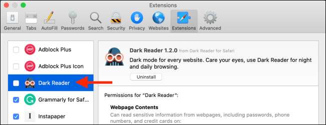 Dette åbner panelet Udvidelser i Safari. Klik på fluebenet ud for “Dark Reader” for at aktivere udvidelsen.
