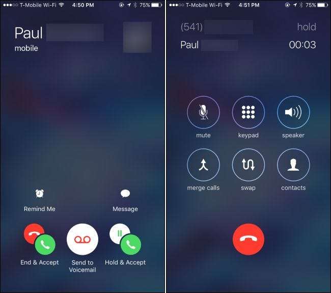 Når den anden person besvarer opkaldet, ser du det første opkald i venteposition og det andet opkald aktivt under det. Hvis du har navnene på personerne i dine kontakter, vises deres navne her. Ellers kan du bare se deres telefonnumre.