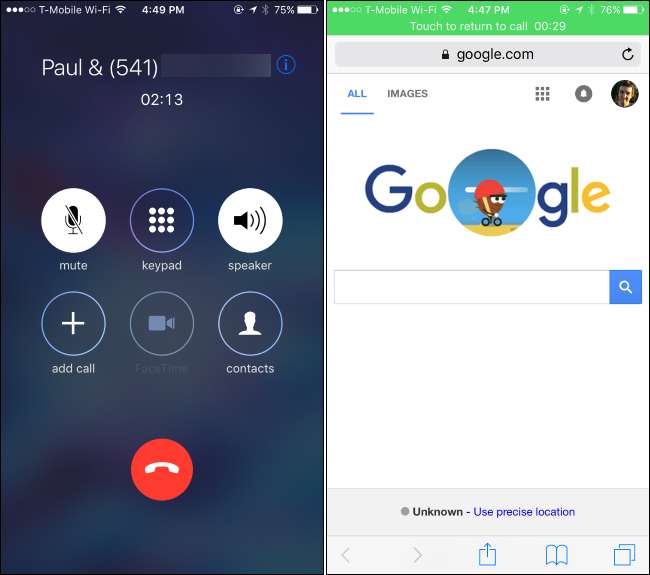 Du er også fri til at forlade opkaldsskærmen og bruge andre apps på din telefon, mens du er under opkaldet. Når højttalertilstand er aktiveret, skal du trykke på knappen "Hjem" på din iPhone. Du er fri til at bruge andre apps (og endda internettet, hvis din operatør understøtter det). Du får vist en grøn bjælke "Tryk for at vende tilbage til opkald" øverst på skærmen, og du kan når som helst trykke på den for at vende tilbage til opkaldsskærmen.