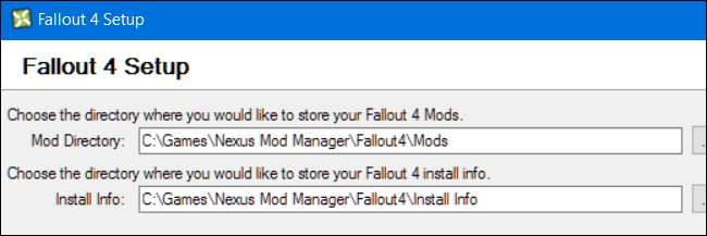 Du får besked om, at du skal konfigurere de stier, hvor Nexus Mod Manager gemmer modrelaterede filer. Klik på “OK” for at fortsætte, og du får vist en skærmbillede til opsætning af Fallout 4. Nexus Mod Manager gemmer som standard disse filer under