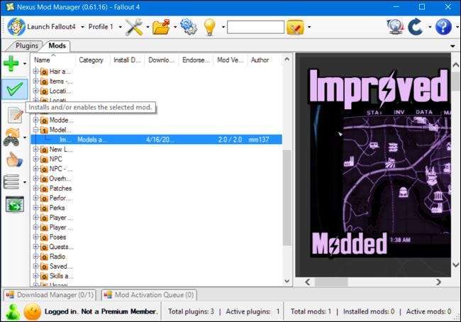 Når det er downloadet og installeret, skal du finde modet på listen, vælge det og klikke på den grønne markeringsknap i sidepanelet for at aktivere det. Du kan klikke på den røde annulleringsknap, der vises på denne placering bagefter, for at deaktivere et mod.