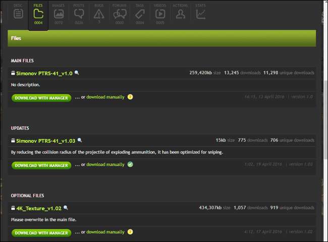 For at downloade flere versioner eller valgfrie filer, som et mod tilbyder, skal du rulle ned på dens download-side og klikke på fanen "Filer". Du får vist de forskellige filer, som modet tilbyder sammen med forklaringer fra modforfatteren om, hvad de laver. Klik på "Download With Manager" for at downloade de ønskede modfiler.