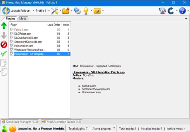 Dette gælder kun mods, der har plugins. Hvis du installerer et mod med et plugin, vises det på fanen "Plugins" samt fanen "Mods". For at kontrollere belastningsrækkefølgen skal du klikke på fanen "Plugins". Vælg et mod, du har installeret, og klik på pil op og pil ned i venstre rude for at justere belastningsrækkefølgen. Oplysningerne om "Masters" for et plugin fortæller dig, hvornår et mod afhænger af et andet mod. For eksempel i skærmbilledet nedenfor afhænger "Homemaker - SK Integration Patch.esp" af Fallout4.esm, SettlementKeywords.esm og Homemaker.esm. Det skal vises efter alle disse andre plugins på listen. Nexus Mod Manager lader dig ikke flytte det over de andre plugins i din belastningsrækkefølge.