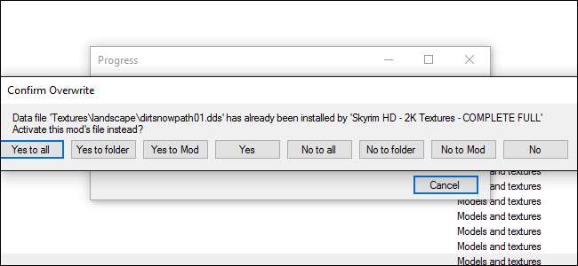 Dette sker, fordi du har to mods - Skyrim HD og Real Ice and Snow - forsøger at ændre Skyrims sne- og isstrukturer. Hvis du vil Ægte is og sne , skal du klikke på "Ja til alle" eller "Ja til mod" for at overskrive Skyrim HDs teksturer. Hvis du foretrækker det Skyrim HDs teksturer , ville du klikke på "Nej til alle" eller "Nej til mod", og eventuelle modstridende strukturer fra Real Ice og Snow ville ikke blive anvendt.