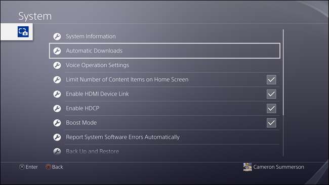 - Installer automatisk: Denne er faktisk en underindstilling til systemopdateringer. Jeg ville være lidt forsigtig med at aktivere denne - hvis du ikke er typen til at gemme dine spil, når du er færdig med at spille, kan denne indstilling virkelig bide dig i halen, fordi det betyder, at PS4 genstarter og opdateres automatisk, mens du er i hviletilstand. Hvis dette sker, mistes ikke-gemte data. Du er blevet advaret.