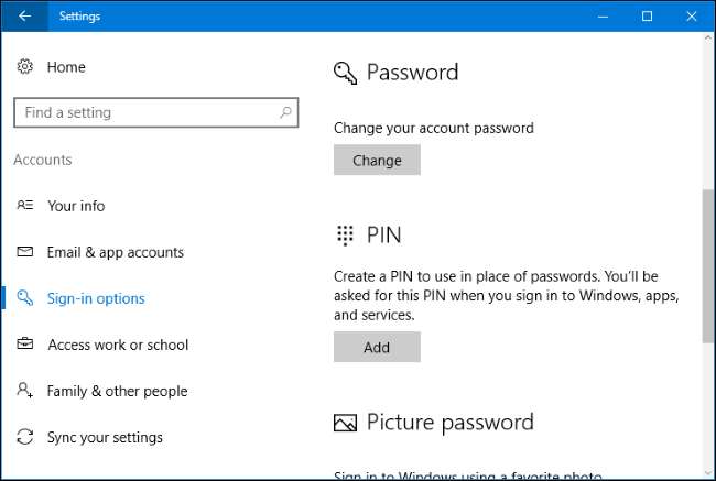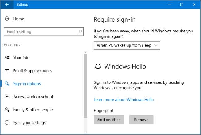 Hvis du har Windows Hello-kompatibel hardware, ser du enten "Fingeraftryk" eller "Ansigt" vises under Windows Hello her. Klik på knappen "Tilføj" for at tilføje et fingeraftryk eller på knappen "Opsætning" for at indstille ansigtsgenkendelse.