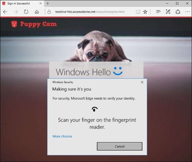 Denne funktion er ikke udbredt i øjeblikket, men Microsoft viser den via Windows Hello Test Drive-websted . Flere websteder og browsere understøtter muligvis det i fremtiden.