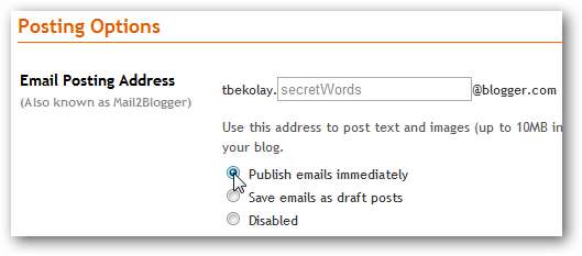 Gå til afsnittet E-mail og mobil. Vælg at offentliggøre e-mails med det samme, og indtast nogle svære at gætte hemmelige ord til den e-mail-adresse, der sendes. Noter posterings-e-mail-adressen, da vi bruger den senere.
