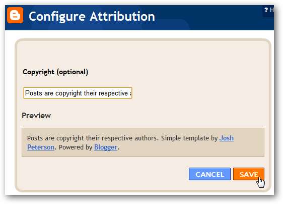 Klik på fanen Design øverst på indstillingssiden. Klik på Redigere link ud for feltet Attribution, og indtast en passende besked om ophavsretten til indlæggene på din blog.