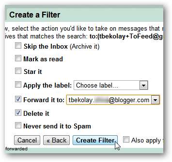 Vi foretrækker at holde vores Gmail-konto fri for disse e-mails i forumtråden, så vi videresender den filtrerede e-mail til posteringsadressen og derefter sletter den. Du kan muligvis anvende en etiket og arkivere den i stedet. Klik på Opret filter efter du har valgt.