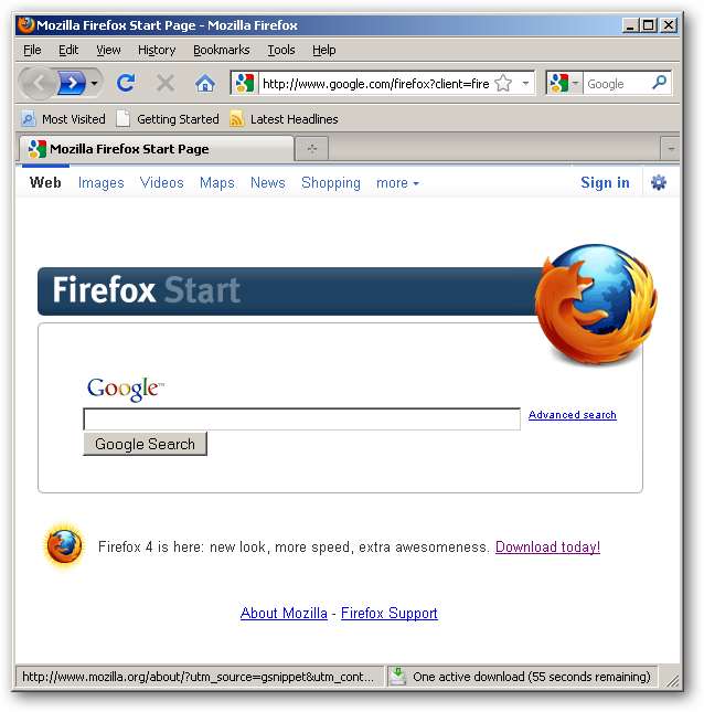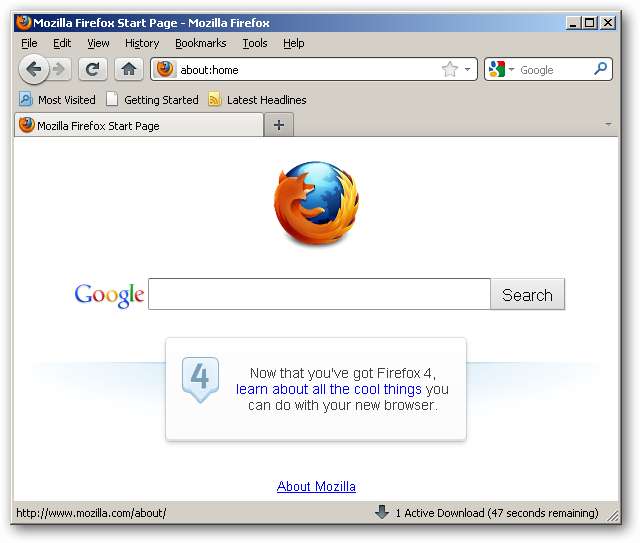 Vi begynder med "ud af boksen" -grænsefladen til Firefox 4. Vi er nødt til at foretage flere ændringer for at efterligne Firefox 3-udseendet: